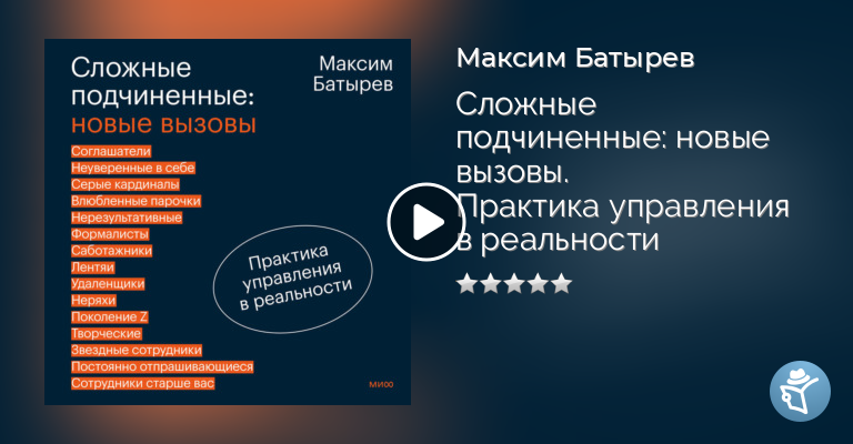Новинка от Максима Батырева. Во второй части «Сложных подчиненных» он собрал новые, актуальные для сегодняшних компаний типы: зумеры, удаленщики, саботажники, формалисты, влюбленные парочки, серые кардиналы и другие. Все описания сопровождаются управленческими решениями и стратегиями действий для каждого конкретного случая. Благодаря им вы сможете скорректировать поведение почти любого подчиненного и получить эффективного командного работника. В книге представлен не только личный опыт Максима Батырева, но и опыт менеджеров со всей страны и из-за рубежа. Для кого эта книга Для руководителей, уставших от конфликтов. Для менеджеров, которые хотят понять зумеров и сотрудников старше себя. Для тех, кто хочет строить команду мечты.