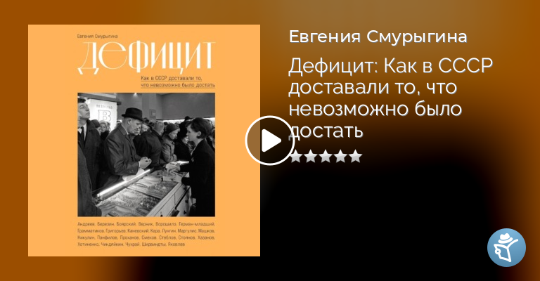 Сборник историй великих российских артистов, режиссеров и актеров об интереснейшем явлении в истории СССР – дефиците. Эта аудиокнига не только о том, на какие ухищрения шли люди, чтобы раздобыть самое необходимое – одежду и обувь, продукты, бытовую технику, книги, машины, билеты в театр и контакты нужных специалистов (врачей, сантехников, автослесарей), – она о самом времени и обстоятельствах, которые так или иначе коснулись почти каждого жителя страны. Это памятник ушедшей эпохе и подтверждение тому, что советский человек мог найти выход практически из любого положения, и не поддавался унынию, и умел радоваться не только огромным победам, но и самым простым вещам.