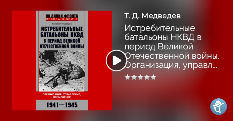 В книге научного сотрудника Санкт-Петербургского института истории РАН, кандидата исторических наук Т.Д. Медведева рассматривается один из малоизученных аспектов истории Великой Отечественной войны: формирование, комплектование, служебно-боевая деятельность истребительных батальонов НКВД. Явившись примером эффективной советской мобилизационной модели военного времени, в отличие от ополчения, они «пережили» всю войну. Автор анализирует организацию, социальный состав, способы боевого применения истребительных батальонов в различных регионах СССР, уделяя особое внимание ключевым этапам их истории: созданию в первые дни войны; служебно-боевой деятельности в тыловой зоне и использованию в боевых порядках Красной армии в 1941—1942 гг.; несению службы на освобождаемой от врага территории, в том числе, на заключительном этапе войны – в западных регионах СССР.