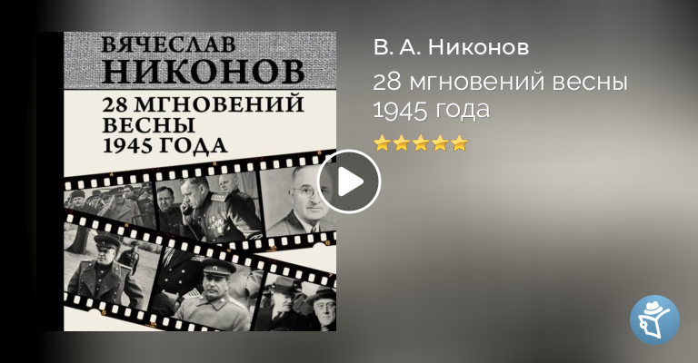 Это книга о Великой Победе. О Победе наших отцов, дедов и прадедов над самым страшным врагом в истории человечества ценой самых больших жертв в истории человечества. Каждый день весны 45-го – шаг к Победе. И каждый шаг стоит десятков тысяч жизней. И никто не знает, сколько шагов еще надо пройти, кто останется жить, а для кого этот шаг станет последним. Каждый день приближает гибель все еще мощного нацистского зверя. И происходит, казалось, немыслимое: союзники в битве с фашизмом идут к столкновению друг с другом, к «холодной войне». Мы вместе переживем каждый день весны 45-го. Побываем на полях жесточайших сражений. В Кремле. В Берлине. В Вашингтоне, Лондоне, Токио, Париже, Риме. Вспомним каждый день, который приближал Победу, и отдадим дань памяти тому поколению наших предков, которые подарили нам свободу и саму жизнь. И лучше поймем себя и мир, в котором живем сегодня. Вячеслав Алексеевич Никонов – известный российский политик, аналитик, телеведущий. Депутат Государственной думы Федерального собрания Российской Федерации. Доктор исторических наук, декан факультета государственного управления Московского государственного университета имени М.В. Ломоносова. Автор более четырех десятков книг и множества телепрограмм о российской и всемирной истории и современности.