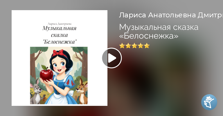 Аудио книга к электронной книге Музыкальная сказка «Белоснежка». Аудио-версия озвучена голосами детей и взрослых, принимавших участие в постановке сказки на сцене Дворца Творчества Детей и Молодёжи г.Тверь. Версия этой сказки написана композитором и сценаристом, руководителем Музыкального театра Ларисой Дмитриевой(Морозовой)для постановки Музыкального театра «Амадей» в 2008 году. Рекомендуется для музыкальных руководителей детских и взрослых театральных коллективов. В главных ролях: Белоснежка – Алина Шмелёва, Принц – Никита Сидоренков, Отец – Виктор Корчажкин, Королева-Мачеха -Лариса Дмитриева, Стражник – Дмитрий Александров, Зеркало -Екатерина Адамова, от автора – Андрей Дмитриев.Производитель фонограммы -Лариса Анатольевна Дмитриева.
