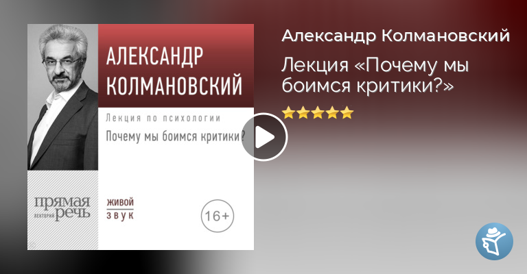 Психолог Александр Колмановский расскажет, как перестать болезненно реагировать на критику, и почему одна критика травмирует, а другая – нет. На то, каким образом мы выражаем своё мнение, влияет наша внутренняя неуверенность. Как распознавать собственные потребности в самоутверждении и отличить содержательную критику от обвинительной? На этой лекции попробуем разобраться, почему одни замечания превращаются в претензию, а другие – в поддержку. Из лекции узнаем: – Почему одни люди склонны критиковать, а другие – помогать? – В чем разница между конструктивной помощью и претензией? – Как наша самооценка определяет реакцию на критику? – Как критиковать, чтобы собеседник услышал и принял ваши советы? – Как конкретно и правильно реагировать на самую неприятную критику?