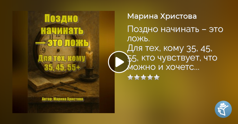 Ты читаешь это – значит, в тебе уже что-то решилось.В этой книге нет крика: «Соберись, тряпка!»И нет сиропа: «Ты уникален(на), всё получится».Здесь есть честный разговор – с тобой. Тем, кто когда-то поверил, что поздно. 30, 35, 45, 55+?Это не «слишком поздно». Это в самый раз, если ты готов(а) жить не по шаблону, а по себе.Ты узнаешь:• Почему голос, который говорит «поздно», на самом деле – не твой.• Как отделить страх от стыда, а мечту – от внушённого «надо».• Почему уход из «нормальности» – это не провал, а взросление.• Что делать, если ты проснулся(лась) посреди жизни и вдруг понял: «она не моя». Эта книга не даст тебе готовых решений.Но она отключит внутреннего цензора и включит голос, который ты давно не слышал(а): свой. Ты начнёшь не «заново», а сейчас.Не для кого-то, а для себя.Потому что поздно – это когда ты умер.Всё остальное – начало.