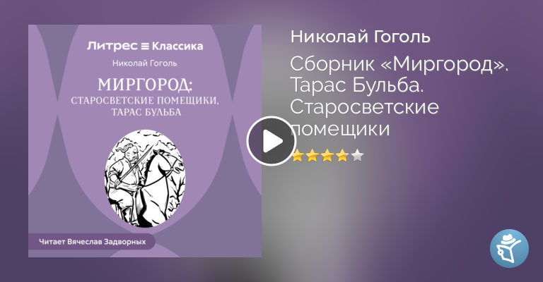 «Миргород» (февраль, 1835) – сборник повестей Николая Васильевича Гоголя, который позиционируется как продолжение «Вечеров на хуторе близ Диканьки». Повести в этом сборнике основаны на украинском фольклоре и имеют много общего между собой. Считается, что прототипами некоторых персонажей стали родные Гоголя и люди, которых он знал, пока жил на Украине. В этом сборнике, в отличие от «Диканьки», где был Рудый Панько, нет единого «издателя», замыкающего цикл рассказов. Несмотря на то, что истории сгруппированы, их можно читать и по отдельности, не теряя смысла каждой повести. Миргород был опубликован в двух томах, по две повести в каждом. В первую часть цикла вошли: «Старосветские помещики» и «Тарас Бульба».