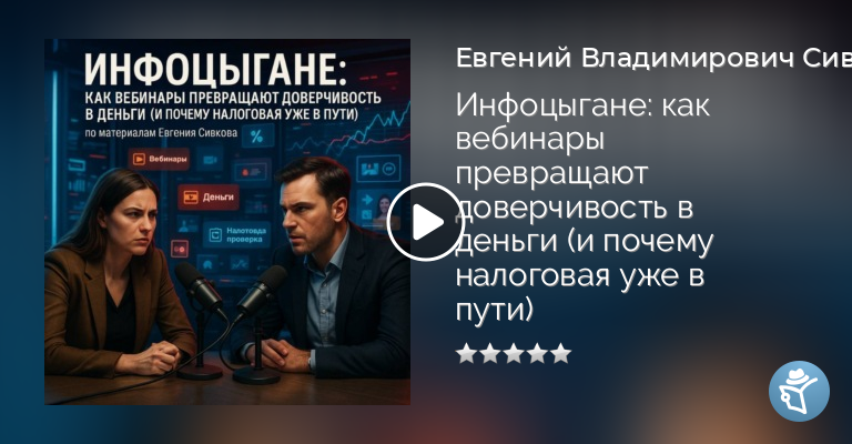 Эта аудиокнига трезвый разбор того, как вебинары и инфобизнес научились превращать доверчивость в прибыль быстрее, чем слушатель успевает нажать «купить доступ». Автор показывает, почему индустрия быстрого успеха стала одной из самых непрозрачных, и как за яркими презентациями скрываются типичные налоговые, юридические и финансовые ловушки. Рассмотрены реальные схемы инфотренеров, подводные камни дистанционных курсов, ошибки слушателей и причины, по которым налоговые органы всё чаще обращают внимание на этот рынок. Материал подан ясно, без иллюзий и излишней драматизации только факты, практика и холодная аналитика. Эта книга пригодится тем, кто хочет разобраться, где обучение, а где просто дорогая картинка, и как защитить свой кошелёк и правовой статус в мире онлайн-обучения.